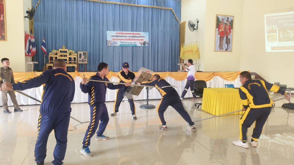 3. ฝึกอบรมและซ้อมแผนการระงับเหตุผู้ป่วยจิตเวชและบุคคลคลุ้มคลั่งโดยใข้ไม้ง่ามขอเกี่ยวตามยุทธวิธี